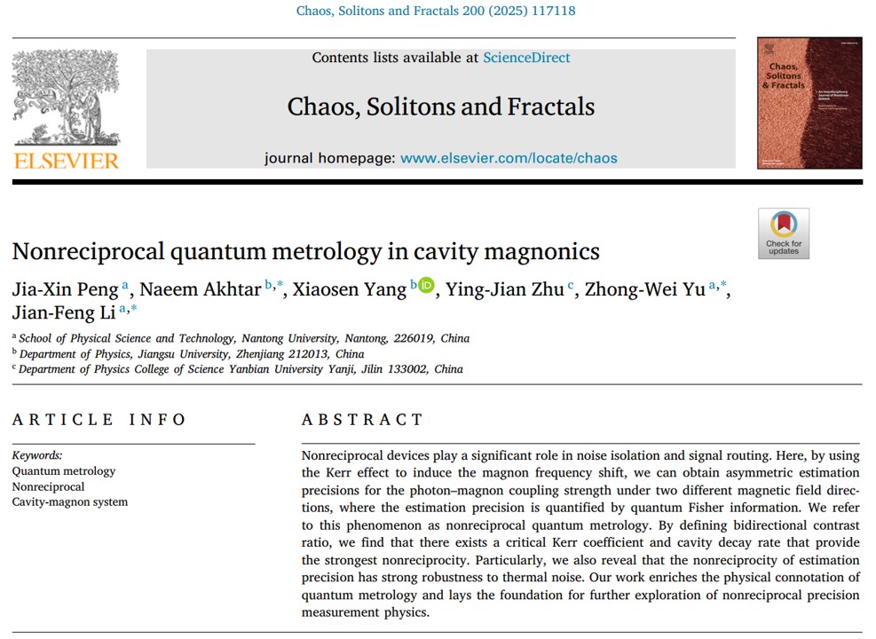 A research team led by Dr. Peng Jiaxin from the School of Physical Science and Technology has achieved novel breakthroughs in nonreciprocal quantum metrology. Their groundbreaking work, entitled "Nonreciprocal quantum metrology in cavity magnonics", has been published in the prestigious international journal Chaos, Solitons and Fractals.